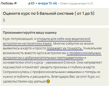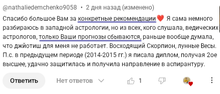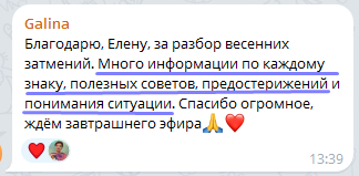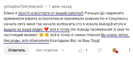 «Мой муж скептик был ошарашен точностью характеристик и описанием ситуаций в его жизни. Уже строит планы на будущее, исходя из твоих рекомендаций».